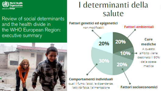 In particolare, quando si parla di determinanti di salute possiamo vedere come siano molti i fattori che contribuiscono alla salute umana e che non si riducono certamente al pronto soccorso o alla somministrazione di una pillola. Fattori genetici, comportamenti individuali, fattori socio-economici e fattori ambientali contribuiscono molto di più alla salute o alla malattia che non le cure mediche.